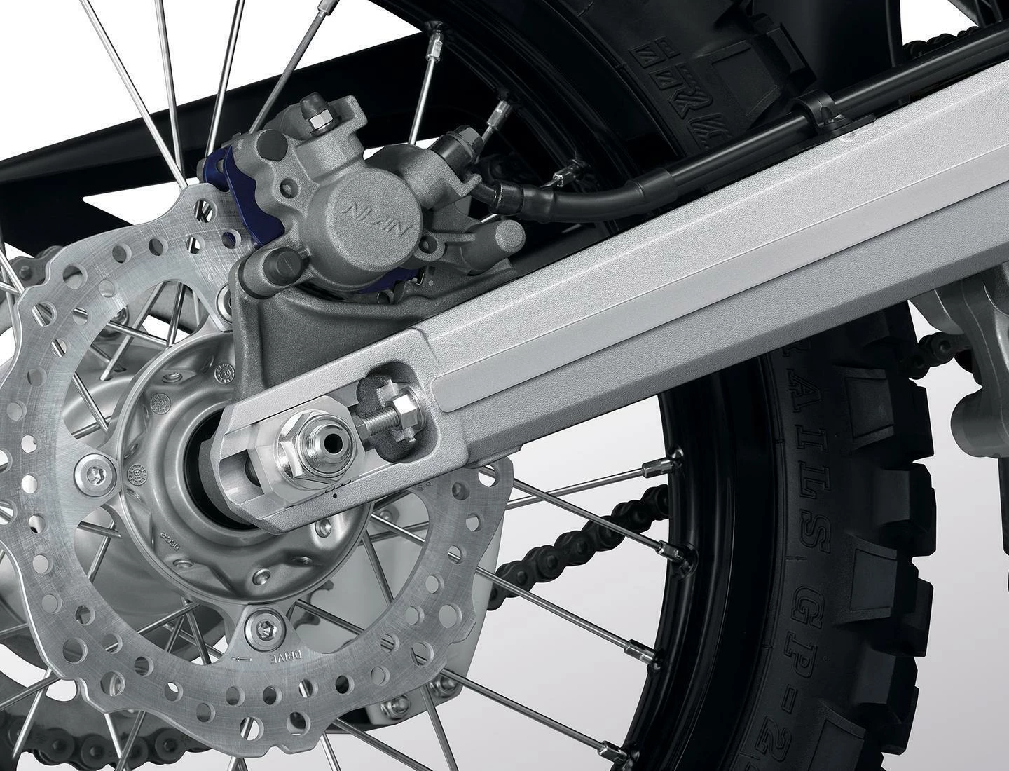 2 Channel ABS as standard with the ability to turn the rear wheels ABS off when exploring on rough terrain. The front brake uses a single 256mm disc gripped by a two-piston calliper, the rear a 220mm disc and single-piston calliper; in common, with the CRF competition machines, the rear master cylinder is now a lightweight, integrated design. The discs feature a wave design – also taken directly from the CRF250R/CRF450R – with exceptional self-cleaning abilities in adverse conditions. 2-channel ABS is standard.