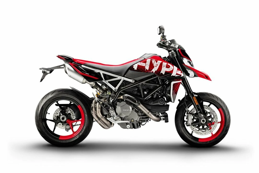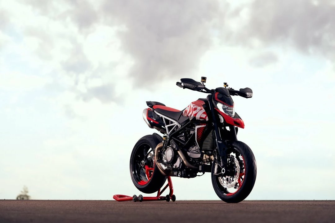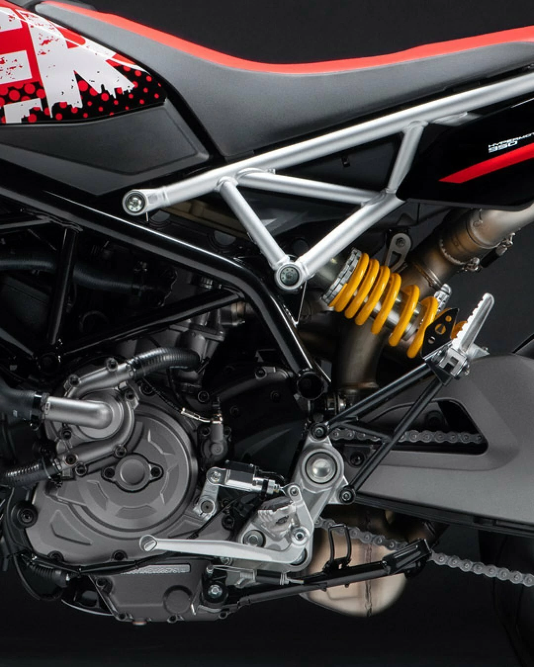 The Hypermotard 950 family features a steel trellis frame with variable-section tubes that weighs one kilo less than the previous model.