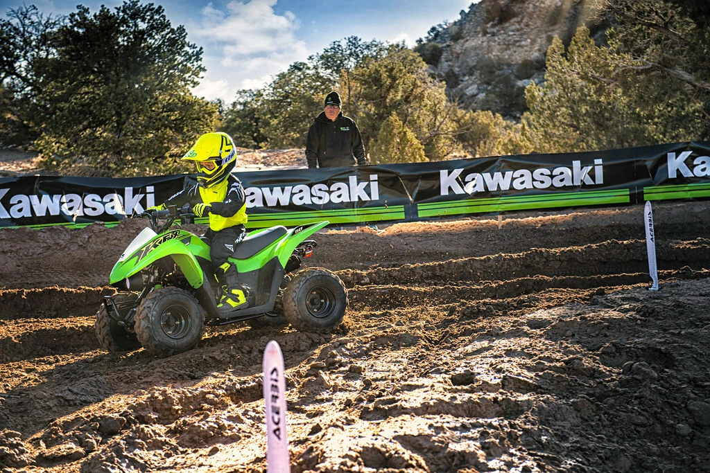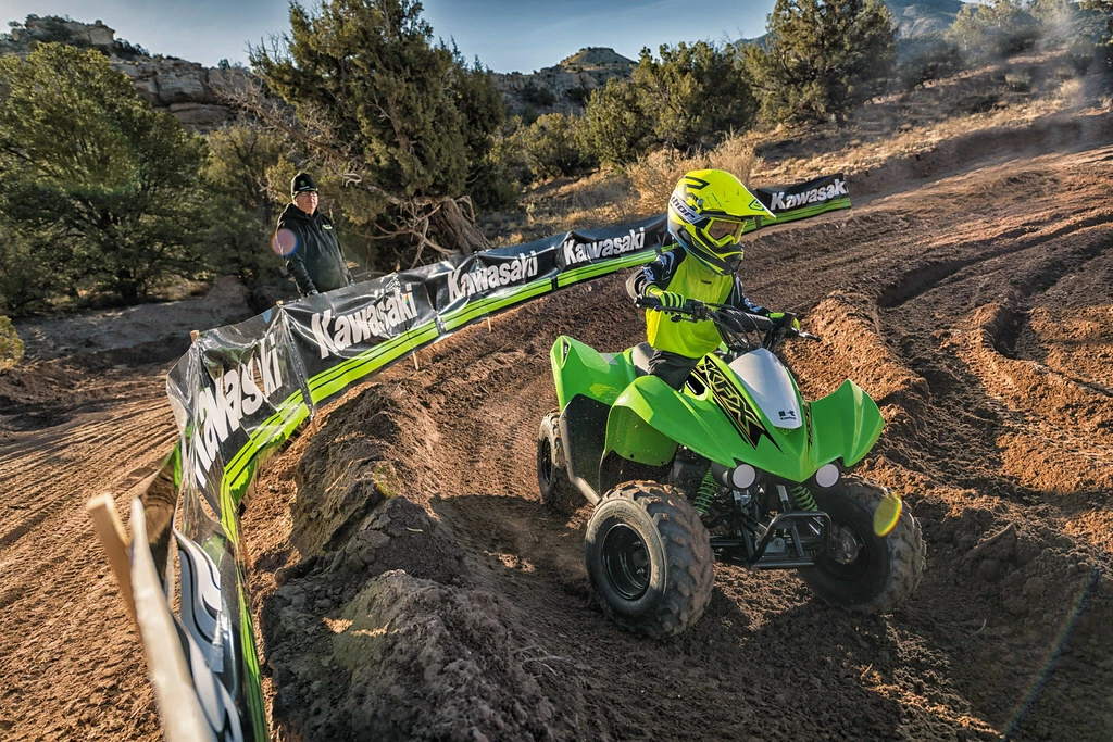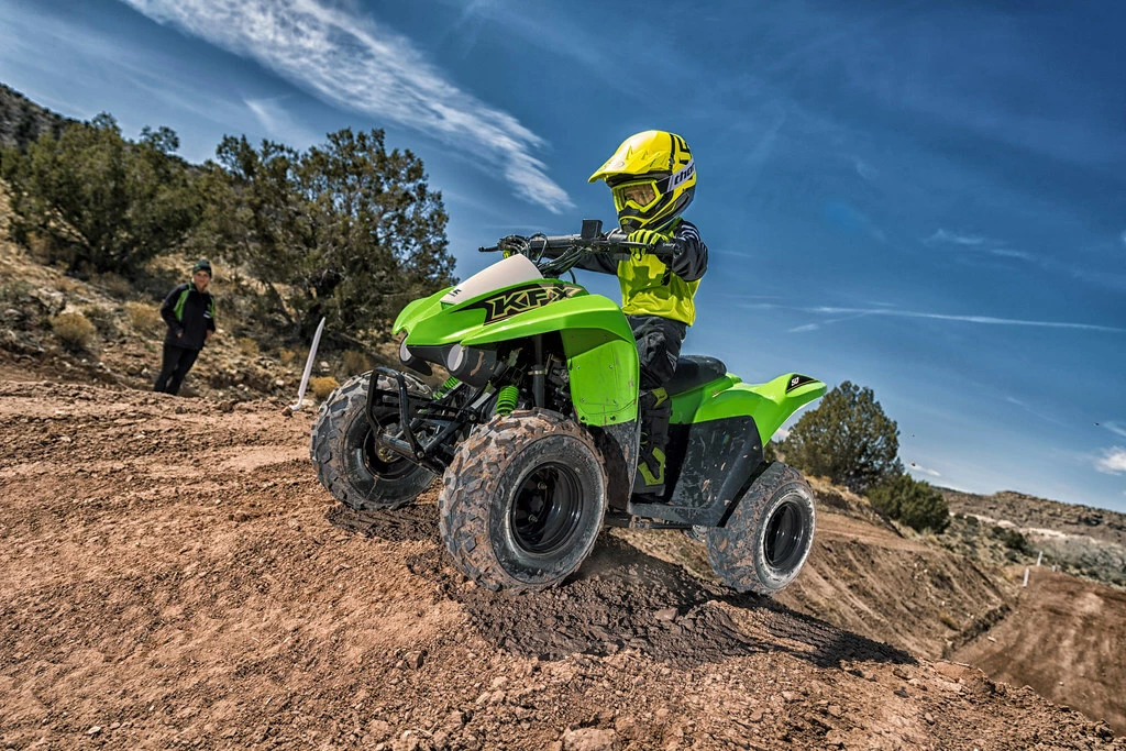 Start them on the right track with the fun of the Kawasaki KFX50. Designed specifically with little bodies in mind, the KFX50 boasts a range of user-friendly features such as a built-in throttle limiter, automatic transmission and low seat height. For extra parental control and safety, the Kawasaki KX50 ATV is fitted with a second rear-mounted, lanyard kill switch. This enables the parent to follow behind and shut the engine down by pulling on the lanyard. The KFX50 is the kid sized ATV that will bring them years of fun and provide a safe learn-to-ride environment.