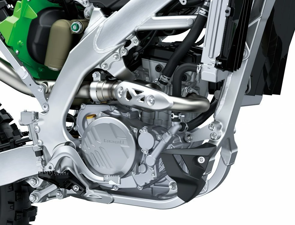 Steering head area with optimised rigidity, main frame rails with revised cross-sections, and a revised line for the swingarm brackets contribute to the overall rigidity balance. Wider lower frame rails also contribute to overall rigidity balance. KX450 swingarm delivers the rigidity to match the frame, and contributes to increased rear traction. Chassis balance and settings were all set to suit race-experienced riders.