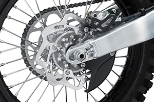Petal disc brakes are among the KX450’s numerous factory-style components. The stylish discs contribute to both sporty looks and a high-quality appearance. Oversized semi-floating 270 mm diameter front disc contributes to strong front brake force, as well as superb controllability. The front brake master cylinder offers better initial control, while contributing to overall braking performance. A large-diameter rear disc 250 mm diameter matches the large front disc and contributes to stronger stopping power.