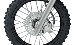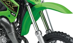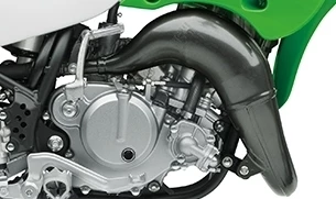 The high-tensile steel frame is constructed from the same strong, lightweight, high-tech materials as the bigger KX Motocross bikes to offer exceptional torsional rigidity for great handling. Reinforced downtube adds strength and durability. The engine and chassis bolts feature a rust-resistant coating. Large cast steel footpegs are designed to resist bending and offer great grip.