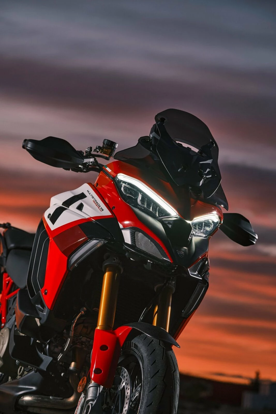 The Multistrada V4 Pikes Peak was developed to bring the sporty qualities of the Multistrada V4 S to the extreme: a dedicated riding position, 17″ wheels with sports tyres, single-sided swingarm, Öhlins suspension and the new Race Riding Mode.