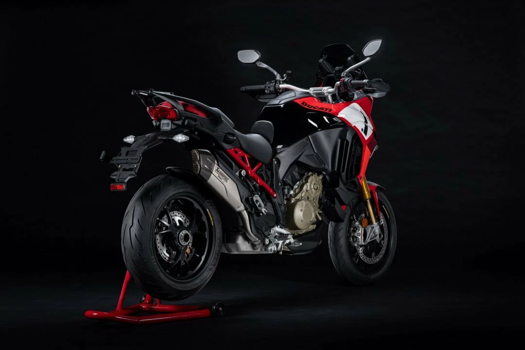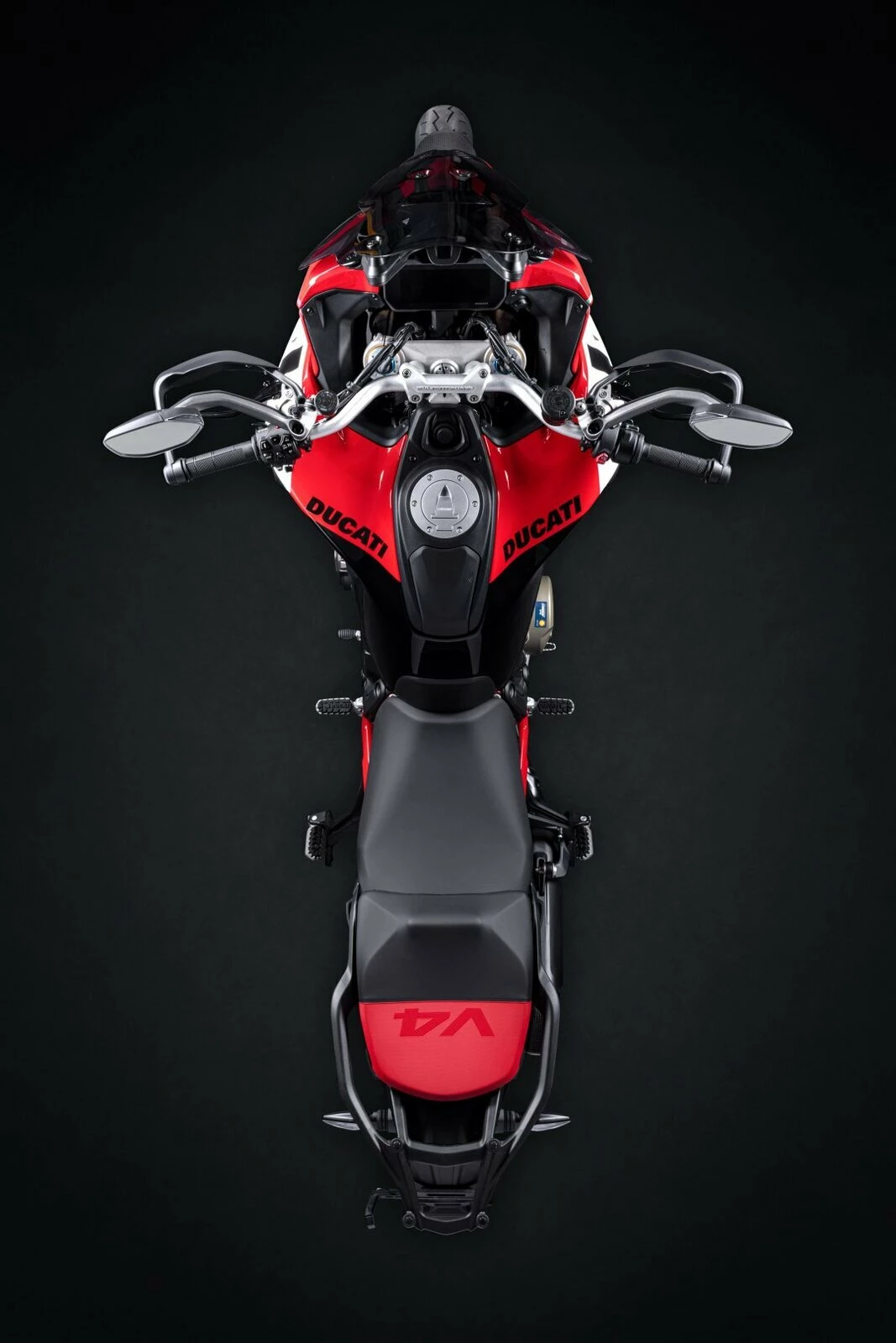 The stylistic elements typical of the Pikes Peak version such as the 17″ front wheel and the single-sided swingarm are enhanced by the functional elements of the new Multistrada generation. A look that reaches the pinnacle of sportiness thanks to the new livery with number plates on both sides inspired by the graphics of the Desmosedici GP ‘21. The passenger seat is two-tone with the “V4” logo visible from above.