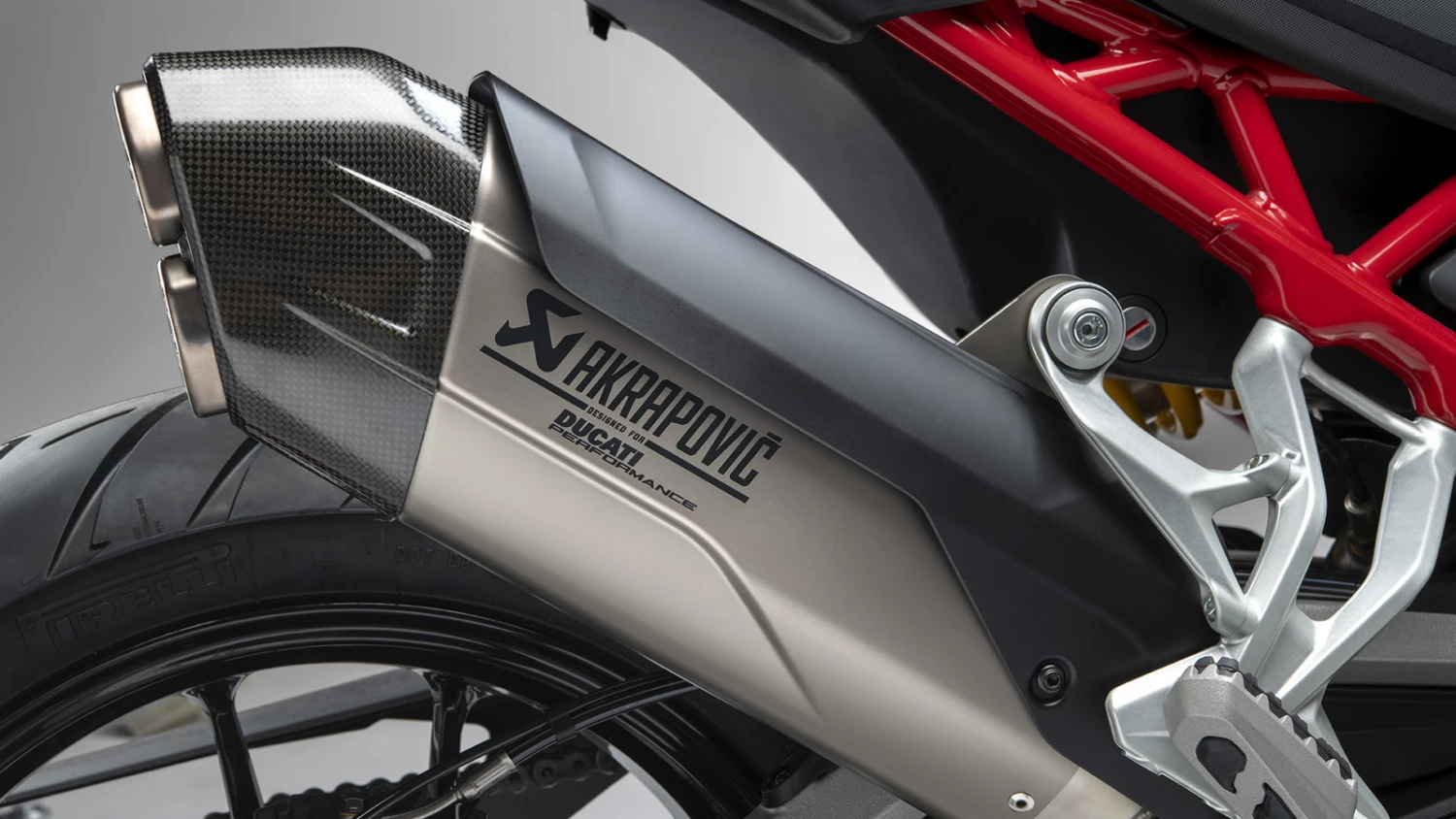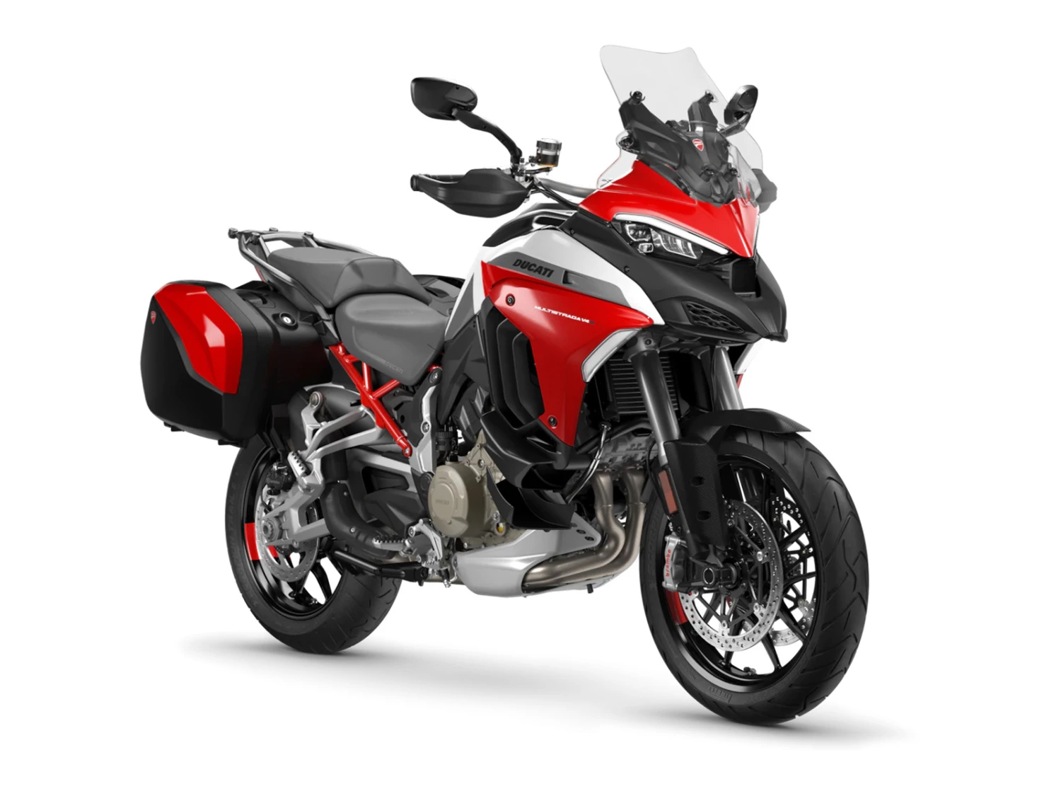 The Multistrada V4 S Sport comes in a special colour, available with either forged or spoked rims. It comes equipped with the V4 S Full trim as standard, including hard side bags, central stand, heated grips and saddles, and a new Radar system technology. An Akrapovič silencer and carbon front mudguard are also part of this premium trim.