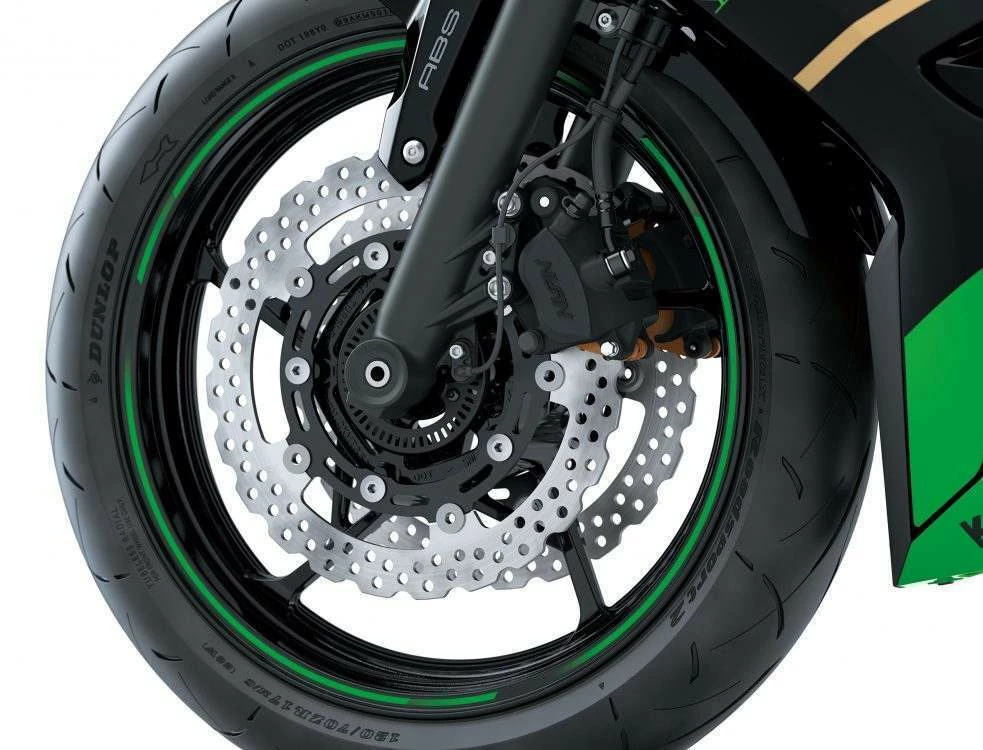 41 mm telescopic front forks handles the suspension duties up front. Horizontal Back-link rear suspension offers a progressive character. It delivers a balance of sporty performance and ride comfort. Dual 300 mm front petal disc brakes deliver strong braking. Dual-piston front calipers, master cylinder and brake pads offer superb brake touch. The Ninja 650 is fitted with front and rear ABS. The rear 220 mm diameter petal disc brake combines with the dual front petal disc brakes to enhances the overall braking performance and sporty appearance.