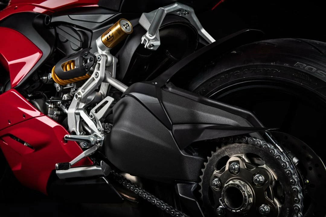 The Panigale V2 features the single-sided aluminium swingarm, the hallmark of every high-end sports Ducati. The extensive fairing highlights the more compact twin-cylinder Superquadro engine (smaller in comparison to the Desmosedici Stradale), creating a bike that is visibly leaner and less intimidating than the Panigale V4.