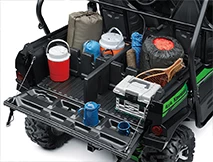 Gas assisted large (700 mm L x 1,100 mm W x 300 mm H), and 272 kg capacity tilt tray of the Teryx’s cargo bed offers substantial carrying capacity. The tailgate can be easy removed without tools to assist with loading/unloading. The blow-moulded tailgate includes built-in cup holders, handy when the tail gate is down. Handy built-in slots in the side walls of the tray allow for optional accessory dividers to be fitted to help separate and secure loads.