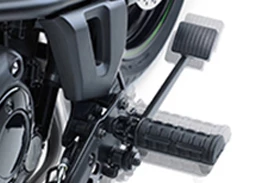 Footrest position adjustable with three positions available: STD, 25 mm forward, 25 mm back. All Ergo-Fit accessories are at an additional cost: Shift Rods, Handlebars and Seats are available. A low 705mm seat height. Thick 62mm padding offers a wide surface and excellent hip support, ensuring ample comfort for city riding and short tours. The seat bracket is rubber-mounted, reducing vibration transferred through the seat. Tear drop-style fuel tank adds a cruiser-style touch. With its 14 litre tank capacity and the Parallel Twin engine’s good fuel economy, the long range offered by the Vulcan S means riders can go longer between fill-ups—convenient in town, and reassuring when out on a daytrip.