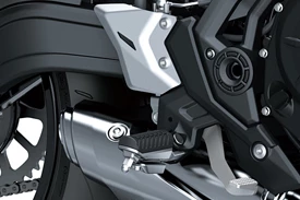 Simple, sleek silencer design adds to the bikes’s overall slim design. Under-engine muffler improves mass centralisation and lowers the bike’s centre of gravity. Muffler internal construction and catalyser layout ensure clean emissions that pass stringent Euro 4 regulations. The muffler’s 33 mm diameter tail pipe also contributes to strong low-mid range performance and response.